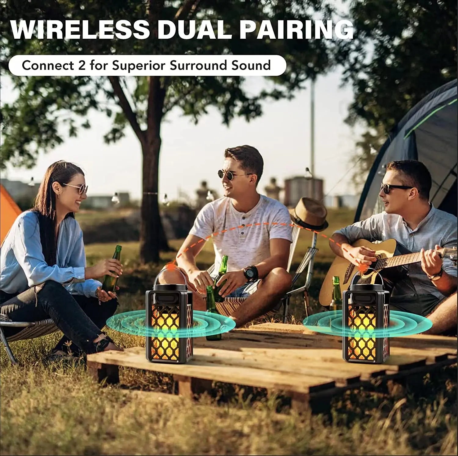 Vivid Flickering Flame & IP65 Waterproof: The portable wireless speaker has a flame atmosphere lamp with 96 LEDs, which shows more real torch light, forming a stunning flame, that mimics extremely realistic & natural dancing flames, to create a romantic atmosphere for you. IP65 waterproof protection safeguards anst rain and dust, which ensures you use it freely outdoors without any worries.